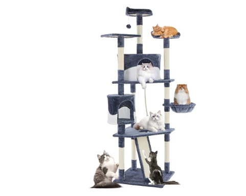 - Interactive Multi-Cat Playground: Crafted from premium particleboard and wrapped in plush fabric, this cat tower creates a cozy resting spot. Extended platforms offer climbing and perching areas, while natural sisal rope-wrapped scratching posts provide durable, safe surfaces for claw maintenance. Hanging basket invite lazy lounging, enclosed cat nests ensure privacy, and all features keep indoor cats energized