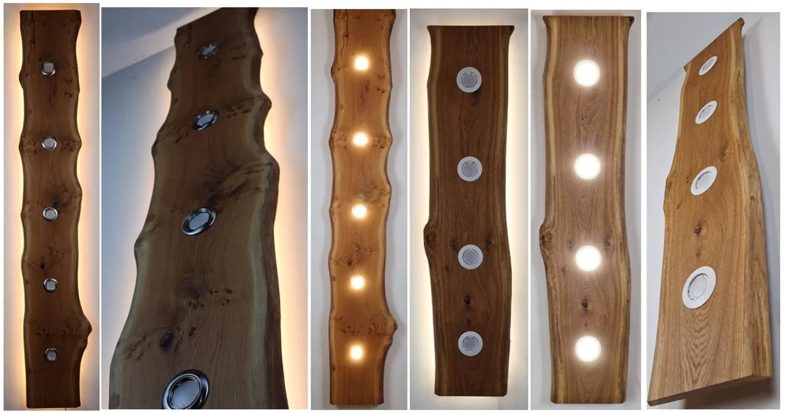 Each lamp is handcrafted from solid wood, showcasing natural grains and a live edge finish that makes every piece unique. The warm white glow creates a cozy, floating ambiance — perfect for living rooms, bedrooms, or hallways.
